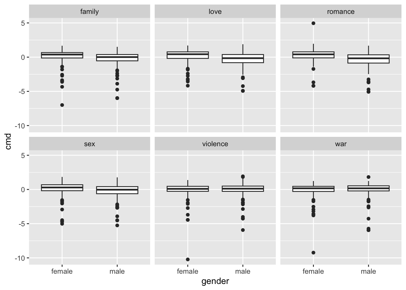 Here we use CMD to compare how male and female authors differ in how they engage with certain concepts. We first create a document-term-matrix and calculate the CMD to words that represent different concepts.