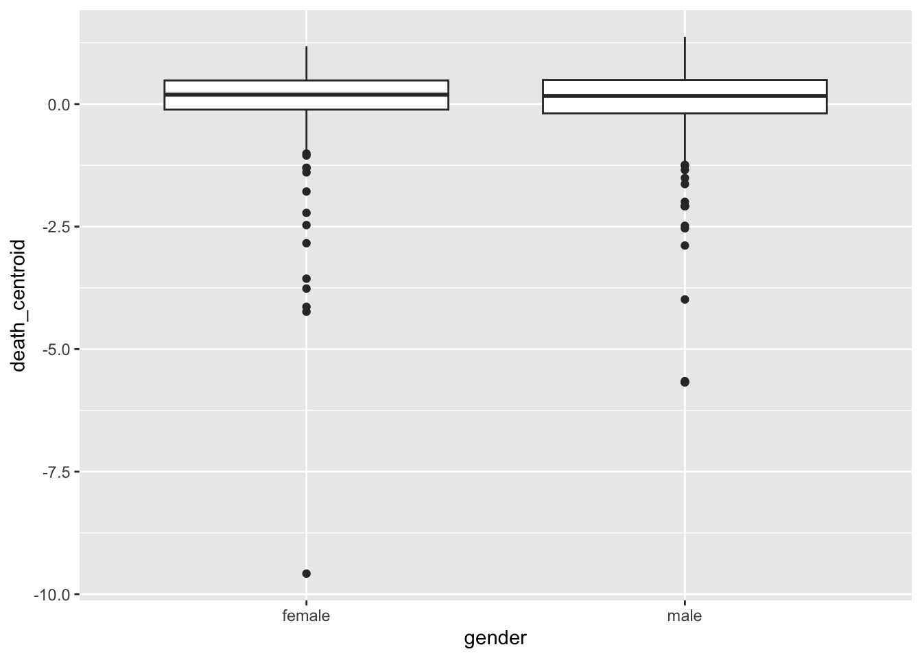 geom_boxplot(aes(gender, death_centroid))Joining with `by = join_by(gutenberg_id)`